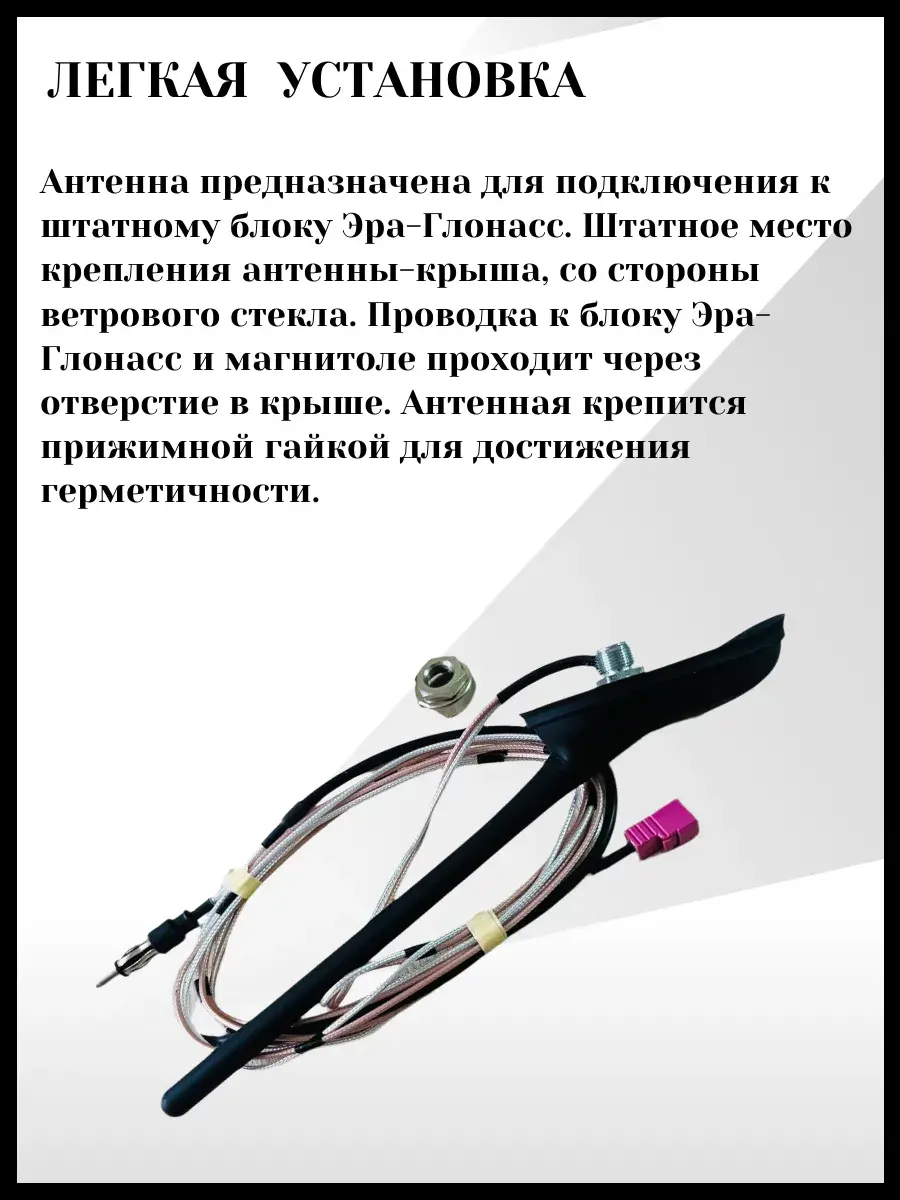 Антенна Нива Урбан штатная арт. 8450082757 комбинированная предназначена для подключения к штатному блоку Эра-Глонасс арт. 8450082753. Штатное место крепления антенны на автомобилях Нива Легенд - крыша, со стороны ветрового стекла. Проводка к блогу Эра-глонасс и магнитоле проходит через отверстие в крыше. Антенная крепится прижимной гайкой для достижения герметичности. Антенна Нива Урбан штатная арт. 8450082757 подготовлена к самостоятельной установке, без обращения в СТО.