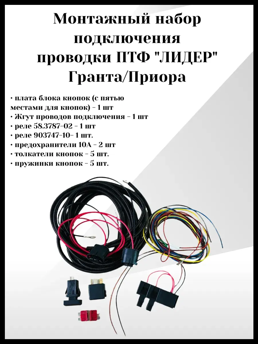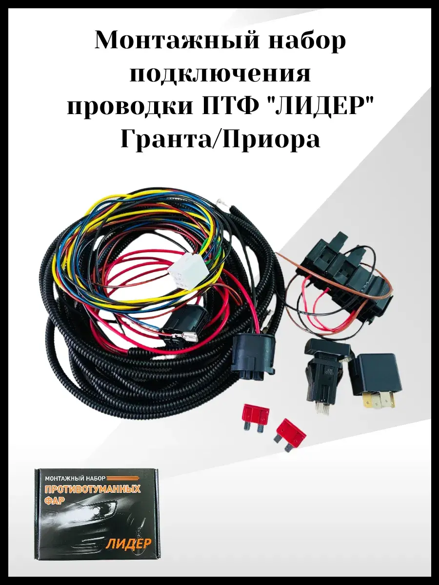 Монтажный набор Лидер для подключения противотуманных фар на автомобили Гранта и Приора. В набор входят все необходимые компоненты для установки и подключения противотуманных фар, такие как провода, реле, кнопки включения и коннекторы. С помощью этого набора вы сможете самостоятельно установить противотуманные фары на свой автомобиль, не обращаясь в сервисный центр.
