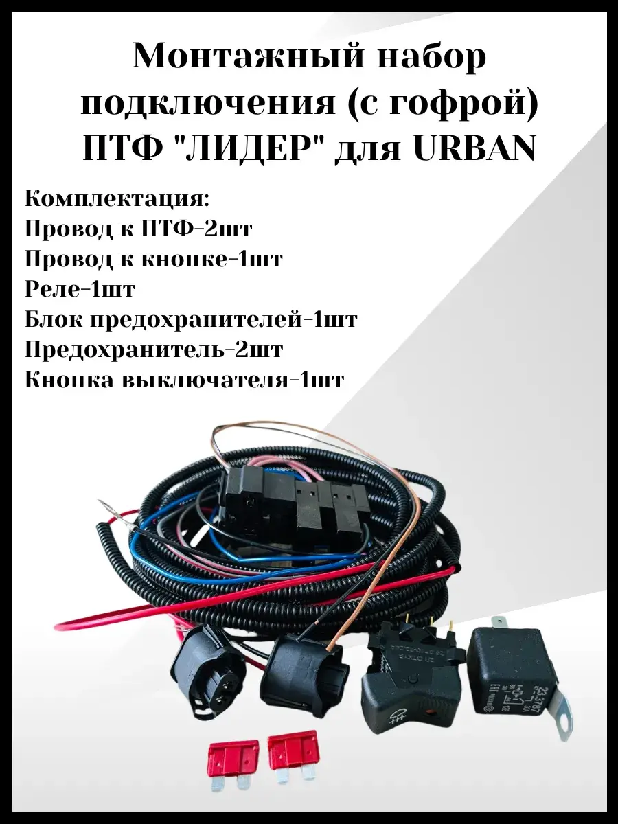 В комплект входят необходимые провода, разъемы, реле, кнопка включения противотуманных фар, коннектор.